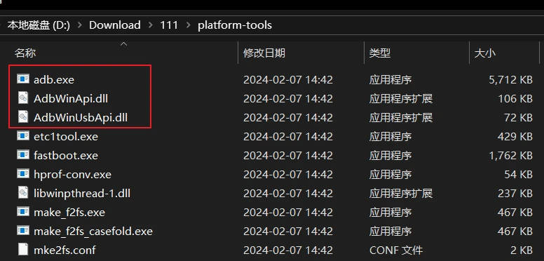 2. 下载后解压,选中红框圈中三个以adb开头的文件,复制到之前gnirehtet下载好的文件夹里。