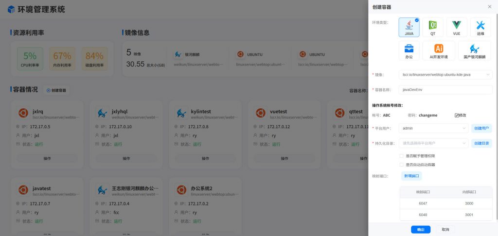 管理端环境创建界面