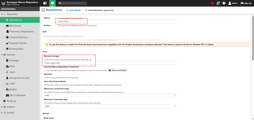 3. 仓库配置,注意 I:name名称会写在url里边 II:remote storage 也就是要代理的源不需要添加simple/ III:客户端需要在最后加上/simple/